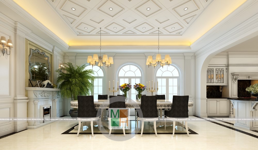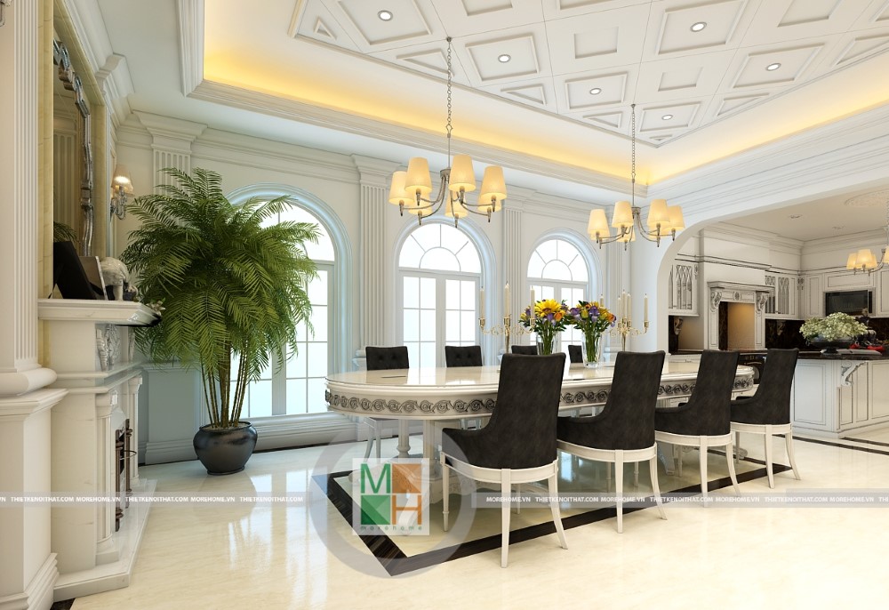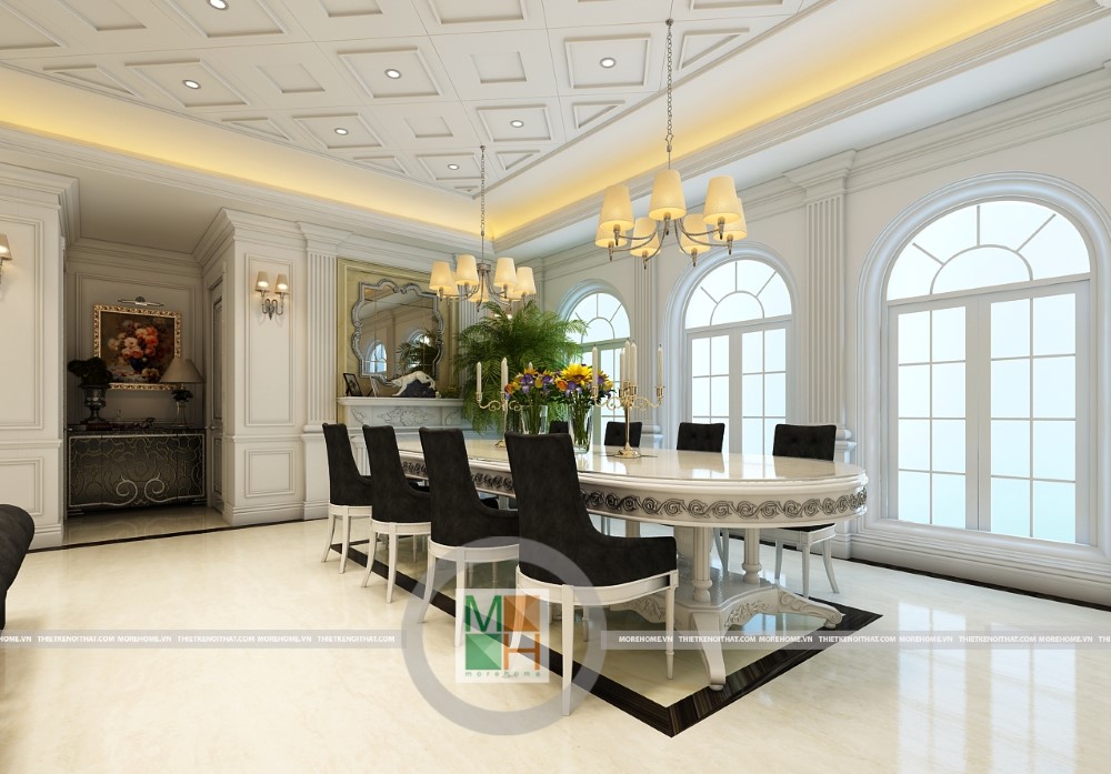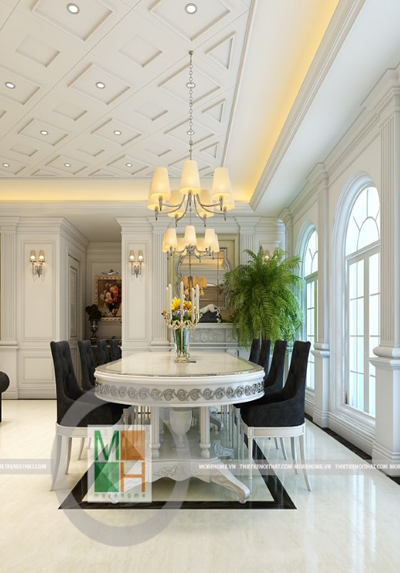 Phòng ăn được sắp xếp ngay gần phòng khách, không hề có vách ngăn cách. Bộ bàn ăn trang trọng cùng tông màu với bộ ghế sofa tạo cảm giác gần gũi và đồng bộ cho gia chủ. Trải khắp từ phòng khách đến phòng ăn chúng ta còn bắt gặp nhiều vật dụng trang trí ấn tượng mang nét đẹp của phong cách thiết kế nội thất tân cổ điển như những bức tranh, lọ hoa, hoa văn trang trí trên bàn ăn, đèn chùm… Ánh sáng cũng được các kiến trúc sư thiết kế nội thất vô cùng chú trọng. Hệ thống cửa sổ được mở rộng đón ánh sáng tự nhiên và tạo độ mở cho không gian.