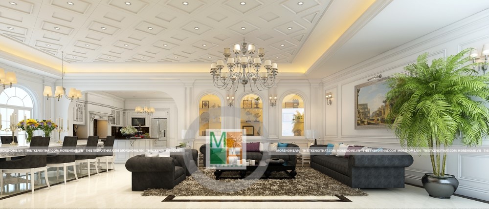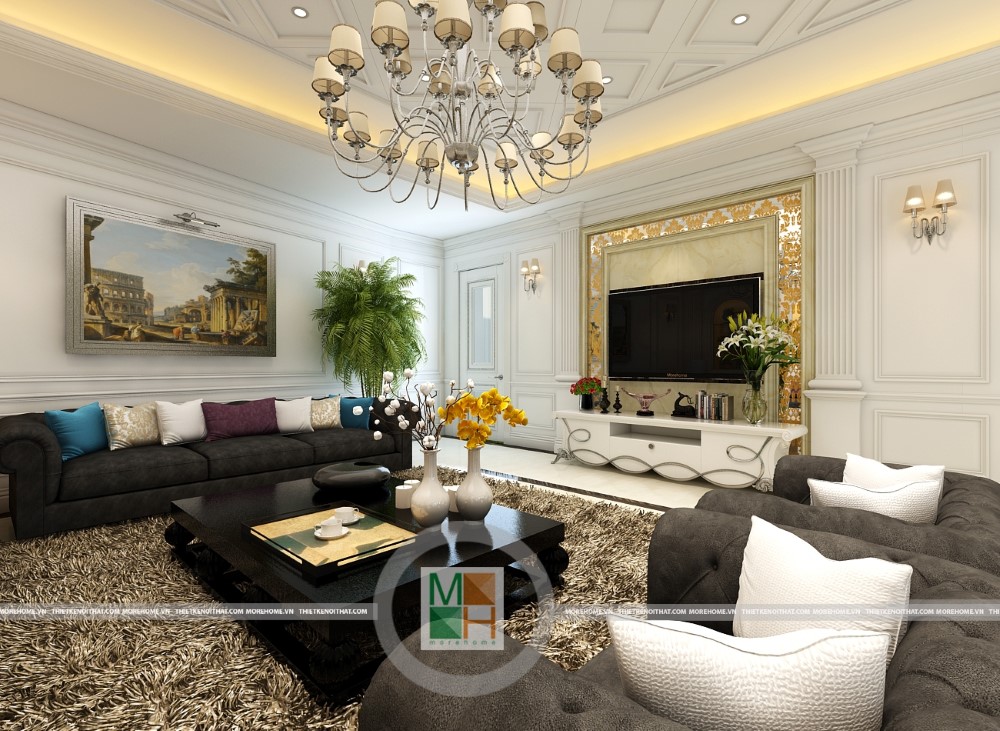 Phòng khách với thiết kế mở rộng, hệ thống đèn được bố trí đối xứng có chủ ý tạo một không gian sang trọng và thu hút. Bộ sofa theo tông màu tối trầm với các chi tiết trang trí điểm xuyết màu sắc từ những chiếc gối tạo sự hài hòa và ăn nhập với phong cách mà các kiến trúc sư thiết kế nội thất đang hướng tới. Đặc biệt không gian kiến trúc xanh cũng được tác giả chú trọng khi tạo điểm nhấn là chậu cây cảnh trong phòng khách. Một điểm đặc biệt không thể bỏ qua ở đây chính là nơi đặt tivi, với thiết kế bắt mắt, đường nét trang trí mang đậm tính cổ điển và quý phái.