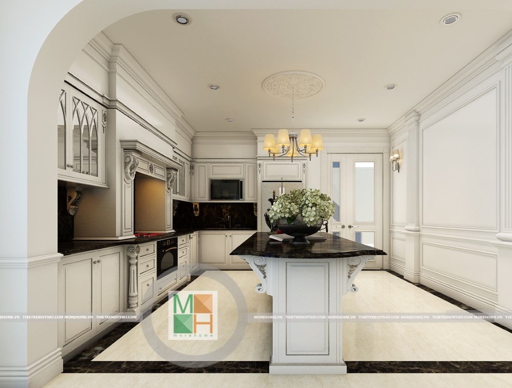 Bên cạnh không gian phòng ăn chính là khu nhà bếp. Với việc tận dụng tối đa không gian trong thiết kế nội thất, các kiến trúc sư đã khéo léo bố trí các tủ bếp ngăn nắp, mở rộng không gian sinh hoạt và tạo độ thoáng cho căn phòng. Tông màu được sử dụng chủ yếu trong thiết kế nội thất bếp là tông màu trắng, đồng nhất với phong cách thiết kế tân cổ điển đang hướng tới.