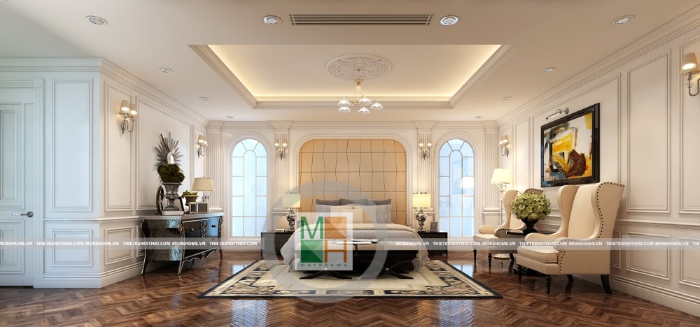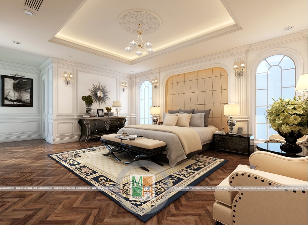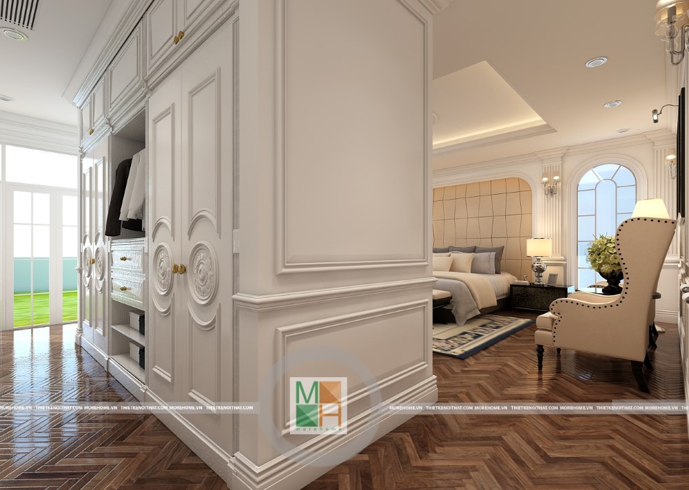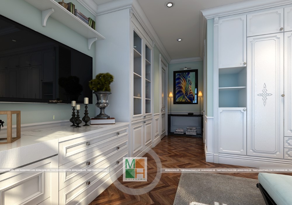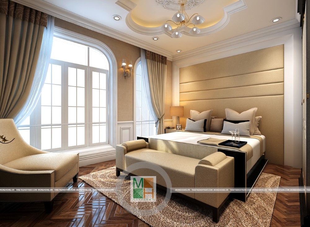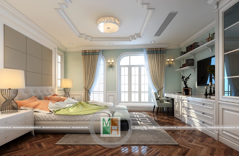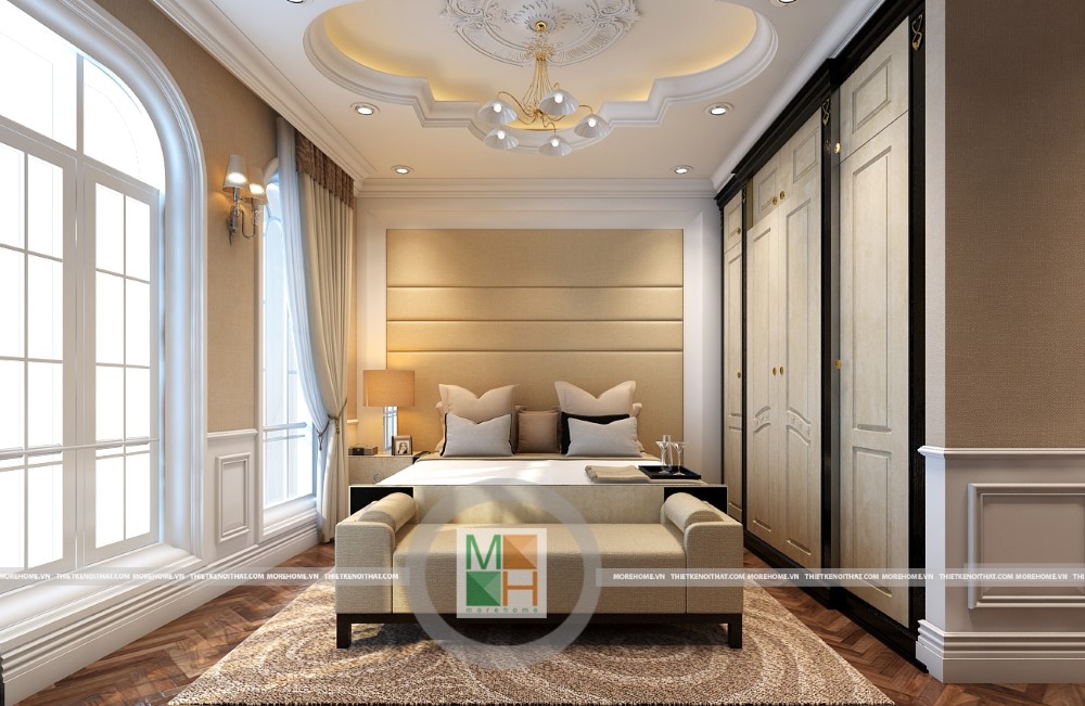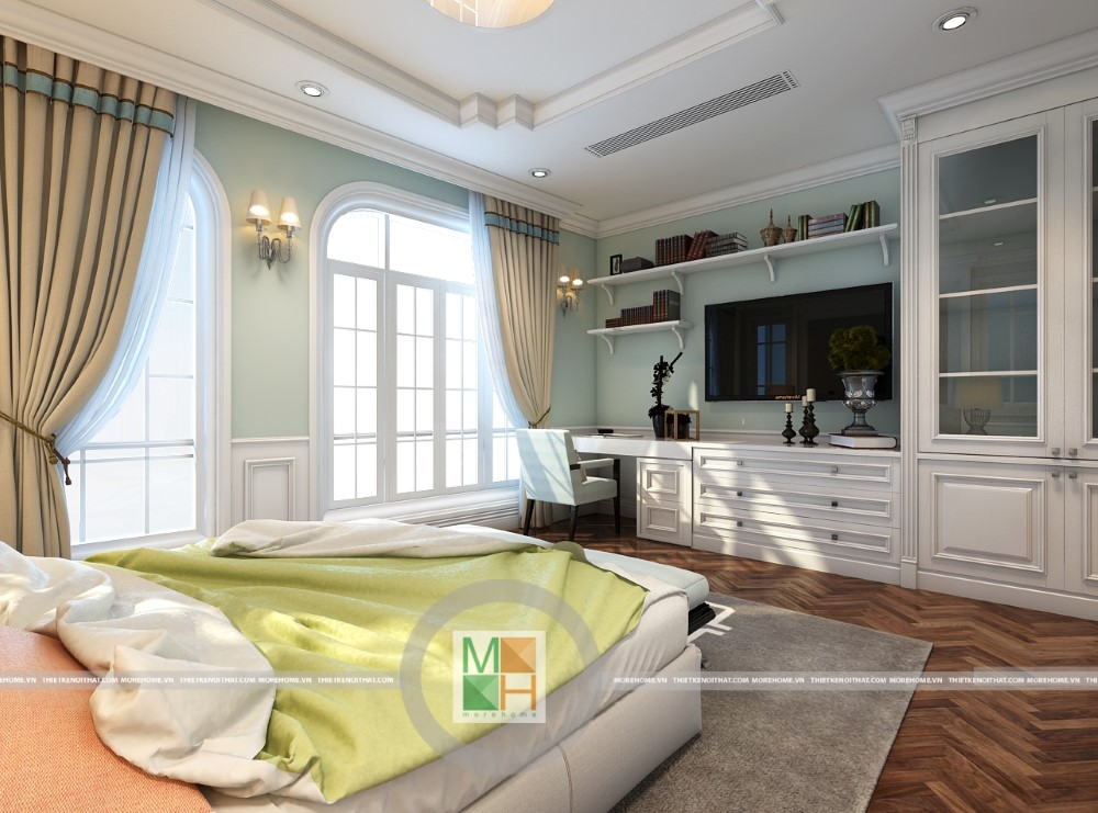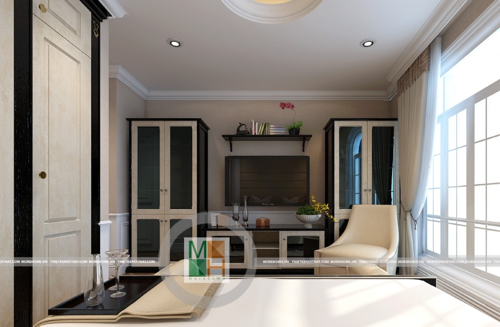Phòng ngủ thứ ba có được thiết kế với hệ thống tủ khá nhiều, tuy vậy nhưng không hề mang đến cảm giác gò bó và hẹp về không gian thiết kế. Một bức tường được các kiến trúc sư thiết kế nội thất cách tân và sử dụng làm cửa sổ đón ánh sáng tự nhiên từ bên ngoài. Các vật dụng trang trí khác như nến, đèn ngủ, các nét trang trí nhẹ nhàng trên tủ hay thảm, rèm cũng góp phần định hình phong cách thiết kế nội thất tân cổ điển cho cả căn nhà.