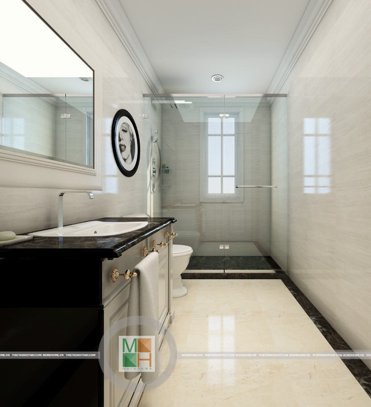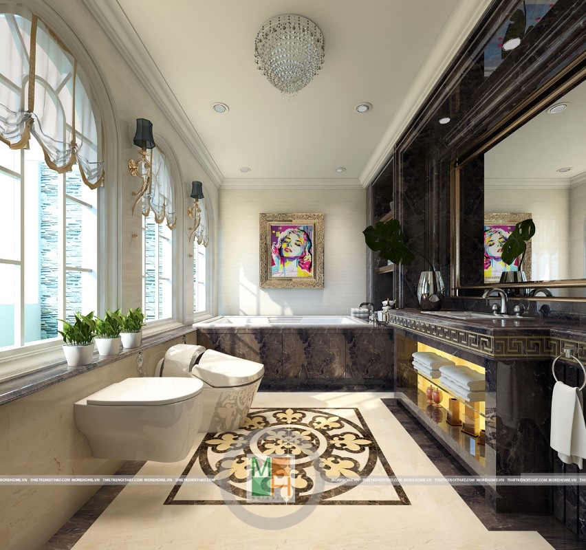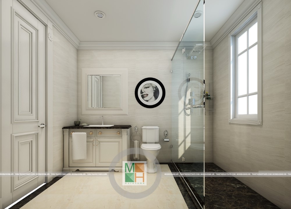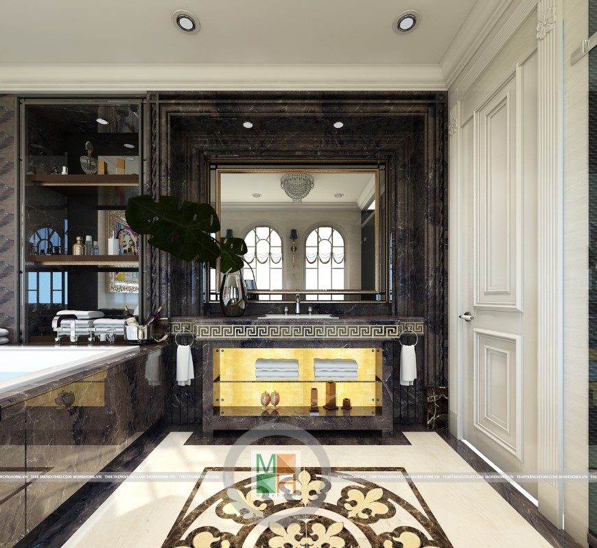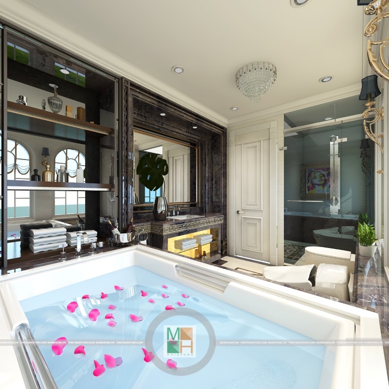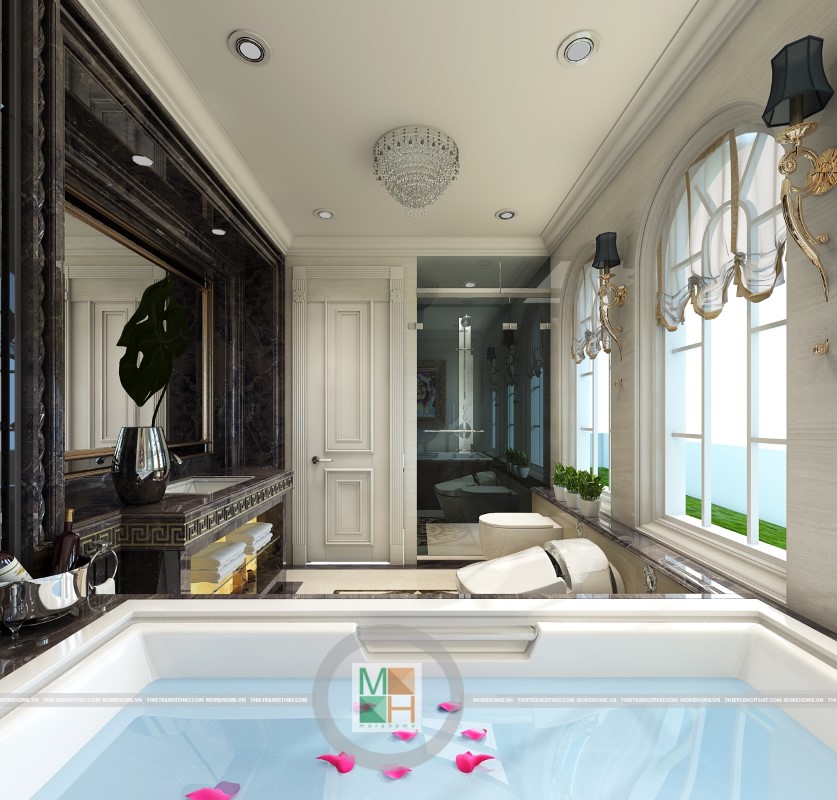 Phòng tắm là nơi mà có lẽ sẽ đem đến ấn tượng sâu sắc nhất trong tổng thể cả căn nhà. Ánh sáng tự nhiên được tận dụng tối đa từ hệ thống cửa sổ trải dài. Các thiết kế nội thất khác với phong cách tân cổ điển thực sự gây ấn tượng mạnh mang lại cảm giác sang trọng và tiện nghi cho gia chủ. Không gian xanh cũng được các kiến trúc sư thiết kế nội thất vô cùng chú trọng với việc sắp đặt có chủ ý các lọ hoa, cây xanh trong phòng. Các chi tiết khác như gạch lát sàn, hoa văn trang trí trên tường cũng góp phần lớn định hình phong cách tân cổ điển cho căn phòng.