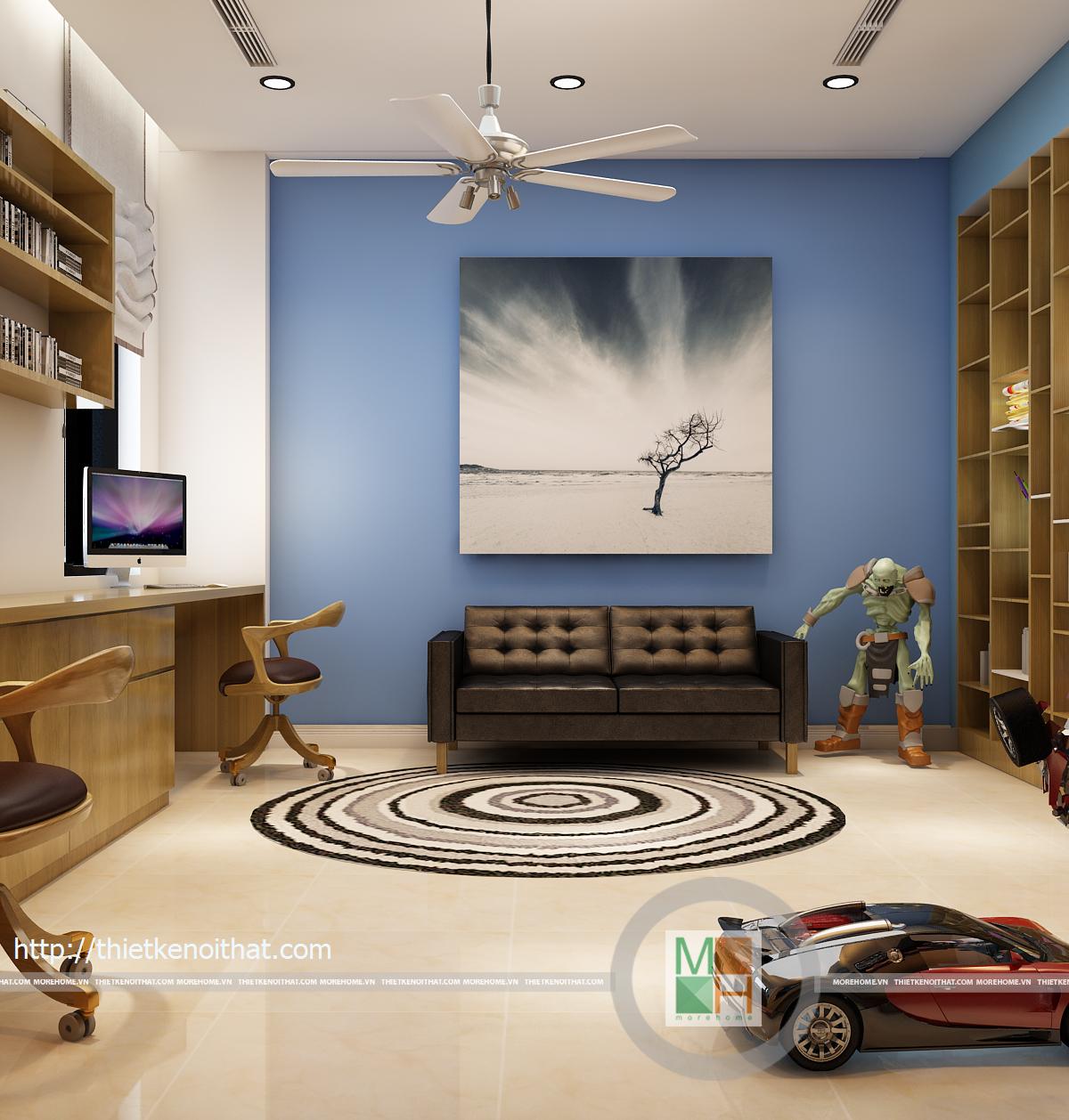 Điều đặc biệt là trong căn hộ được trang bị thêm một phòng giải trí chung cho cả gia đình được sơn một phần màu xanh và cam để tạo cảm giác thư giãn nhẹ nhàng. Tủ sách cỡ lớn trong phòng giúp việc phân loại và lưu trữ sách trở nên dễ dàng hơn. Bàn đọc sách được thiết kế dài hết mảng tường, phù hơp cho hai người ngồi và dễ dàng lấy ánh sáng từ cửa sổ hắt vào. Có thể trang trí thêm cho căn phòng bằng những bức tranh hay món đồ chơi sinh động để phù hợp làm không gian chơi cho con bạn.