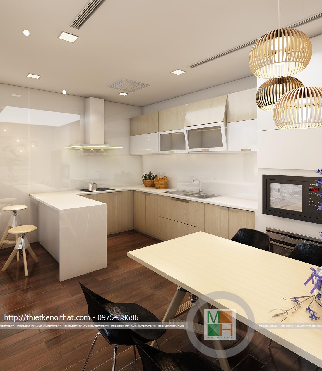 Bếp và phòng sinh hoạt chung được sắp đặt ở tầng hai, tạo sự gần gũi giữa các thành viên trong gia đình. Sử dụng những màu trung tính sáng sủa khiến căn bếp trông rất gọn gàng và sạch sẽ. Những chi tiết làm bằng gỗ như cánh cửa tủ bếp, bàn ăn tạo sự gần gũi, thoải mái khi sử dụng.