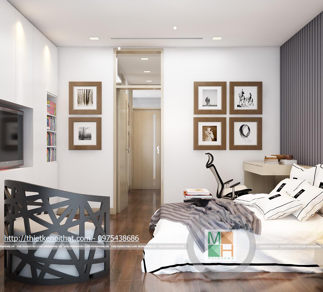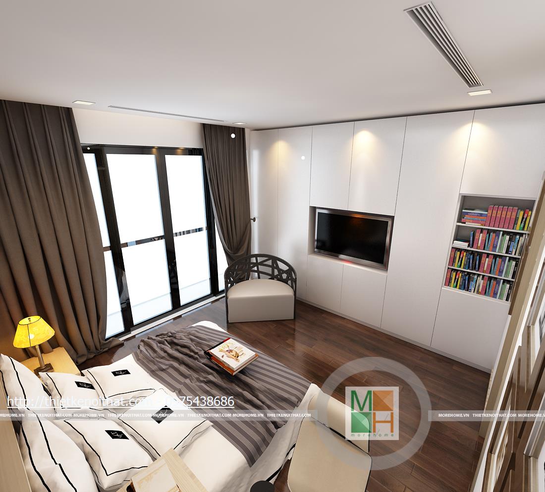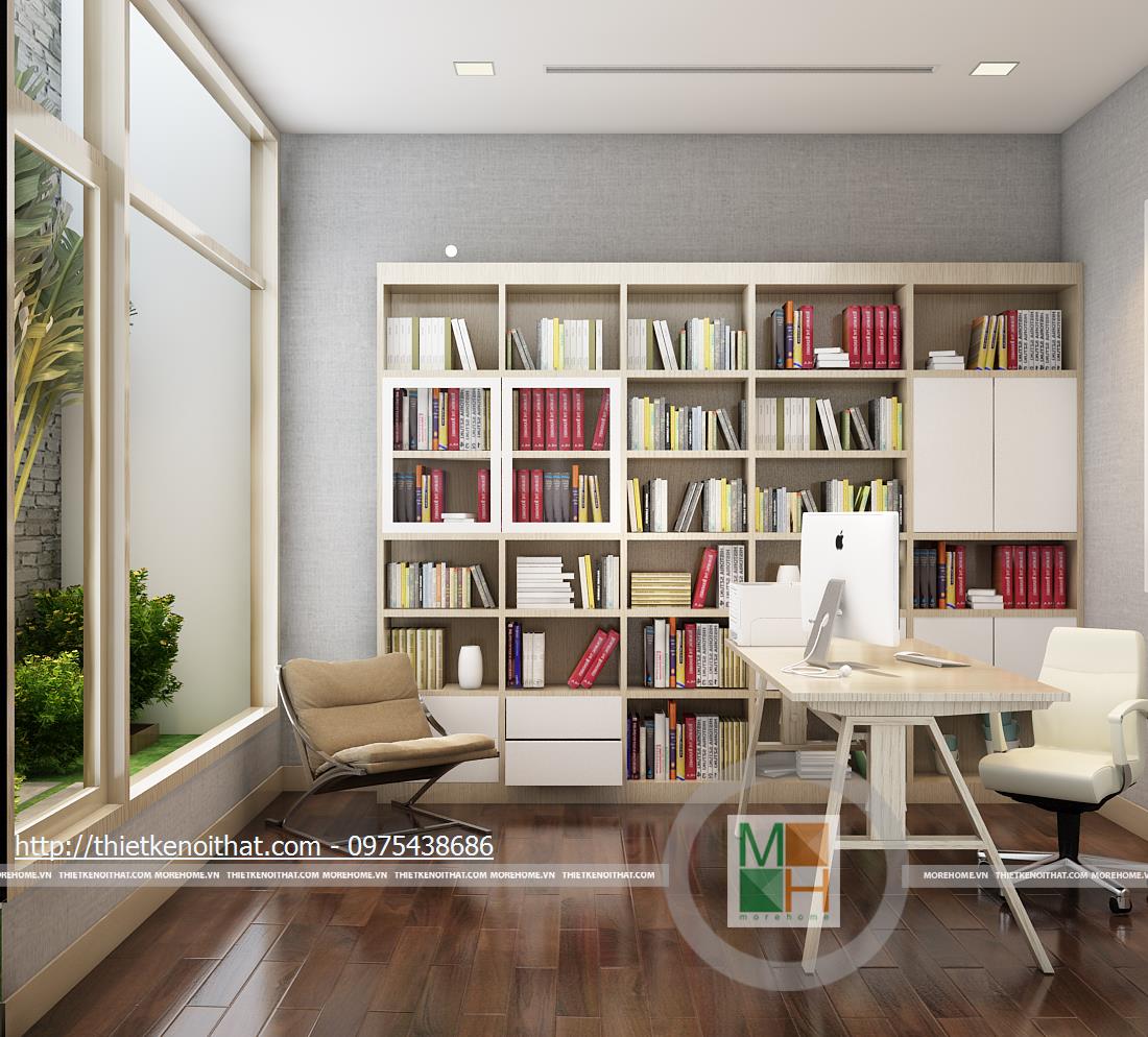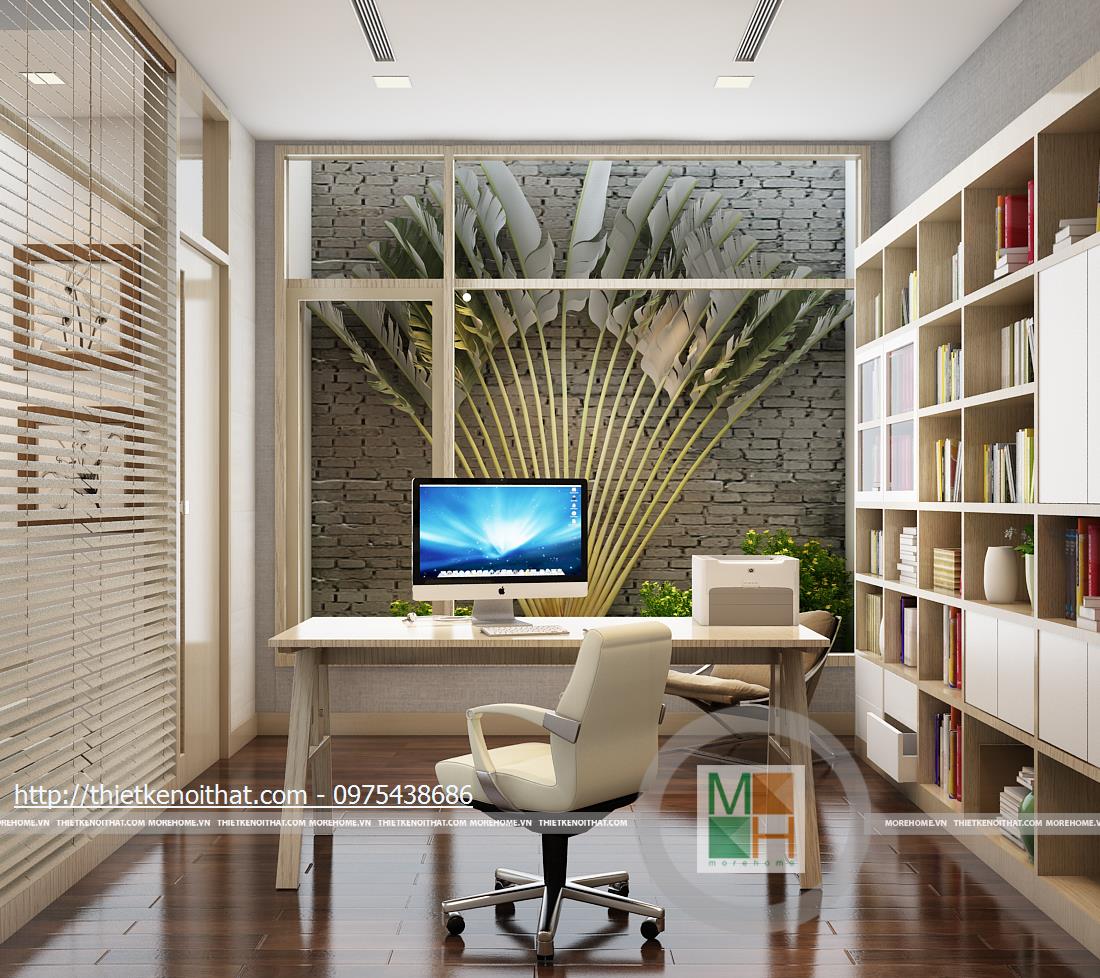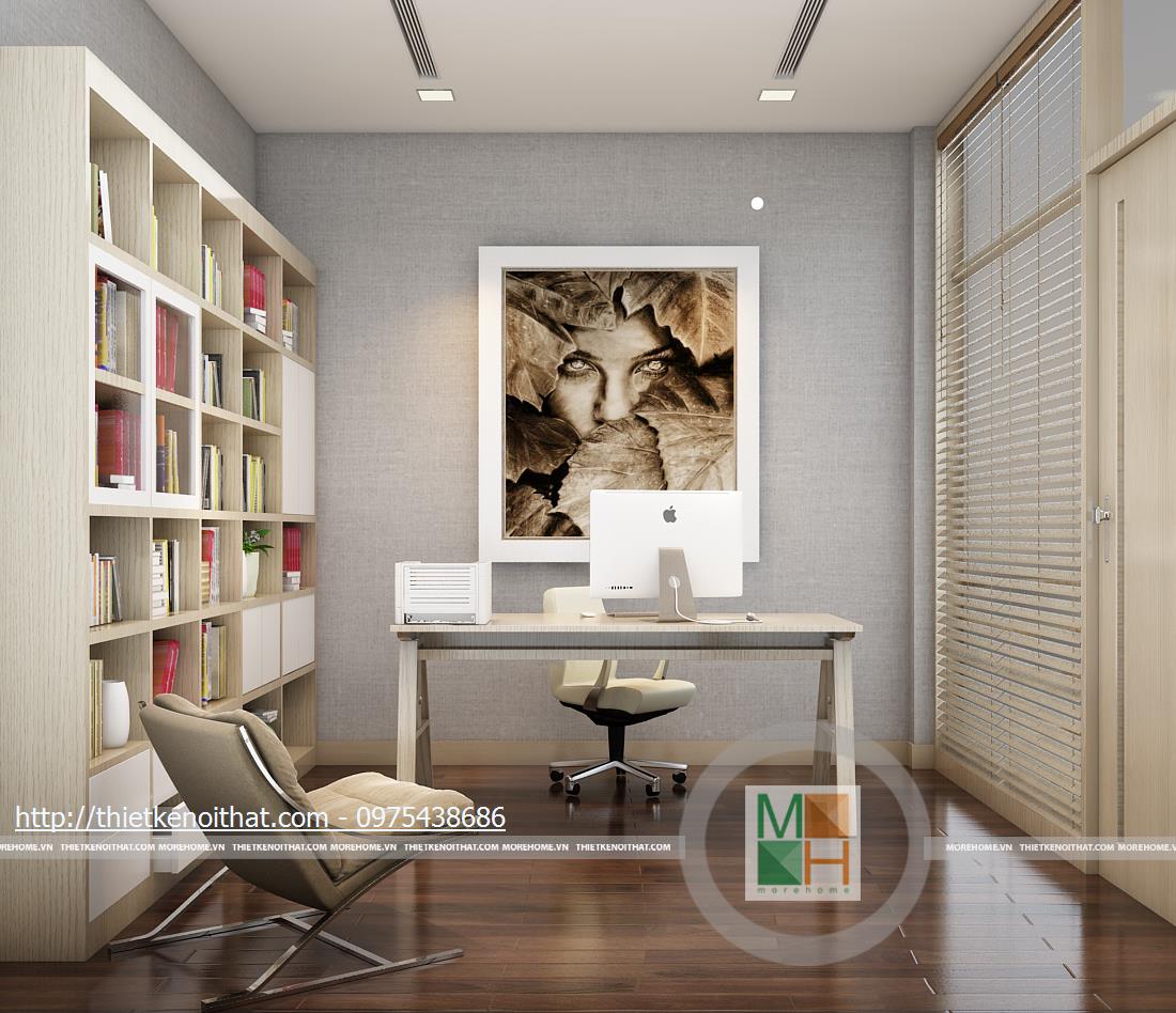Tầng ba bao gồm phòng ngủ bố mẹ và phòng làm việc. Phòng ngủ của bố mẹ không quá cầu kì với màu sắc nhẹ nhàng, ấm cúng. Tủ quần áo âm tường được đặt cạnh cửa ra vào để tránh làm ảnh hưởng đến việc di chuyển trong phòng và cũng tiết kiệm được diện tích. Phần tường đầu giường được bọc vải ghi để tạo điểm nhấn, làm nổi bật đồ nội thất sáng màu. Phòng làm việc với chiếc bàn gỗ đặt giữa và tủ sách kê sát tường đem lại sự tiện lợi khi sử dụng. Bên hông phòng là cửa kính ngăn cách với khu vườn giả, tạo sự gần gũi với thiên nhiên và đem đến tâm lí thoải mái khi làm việc.