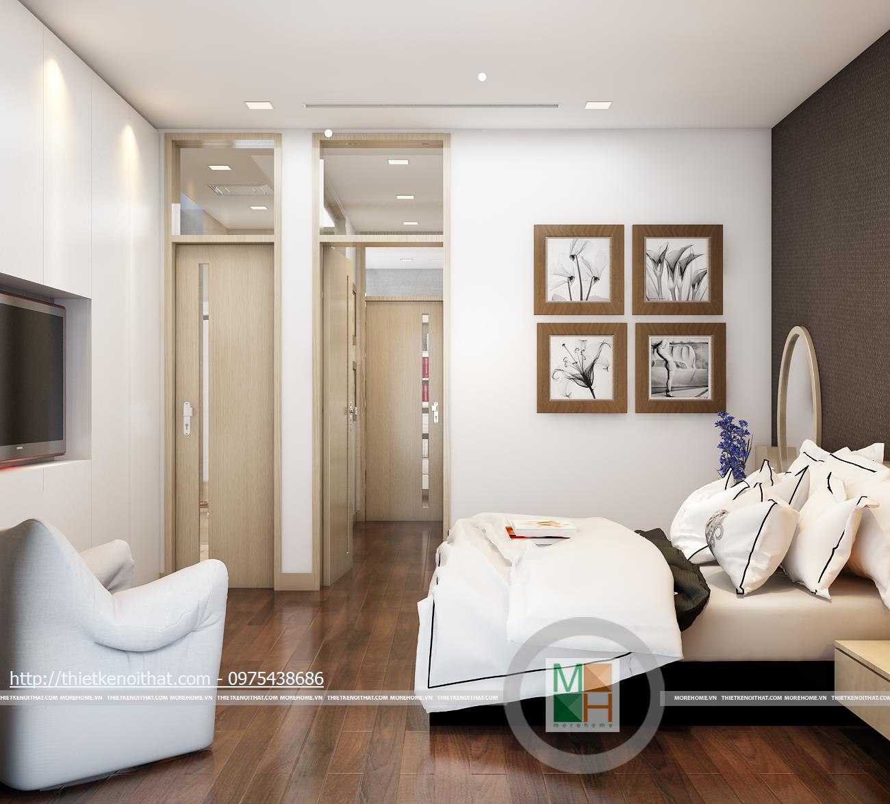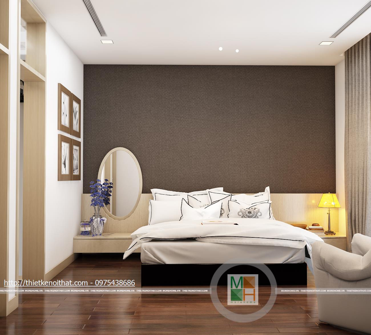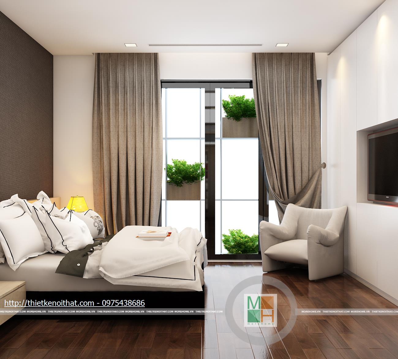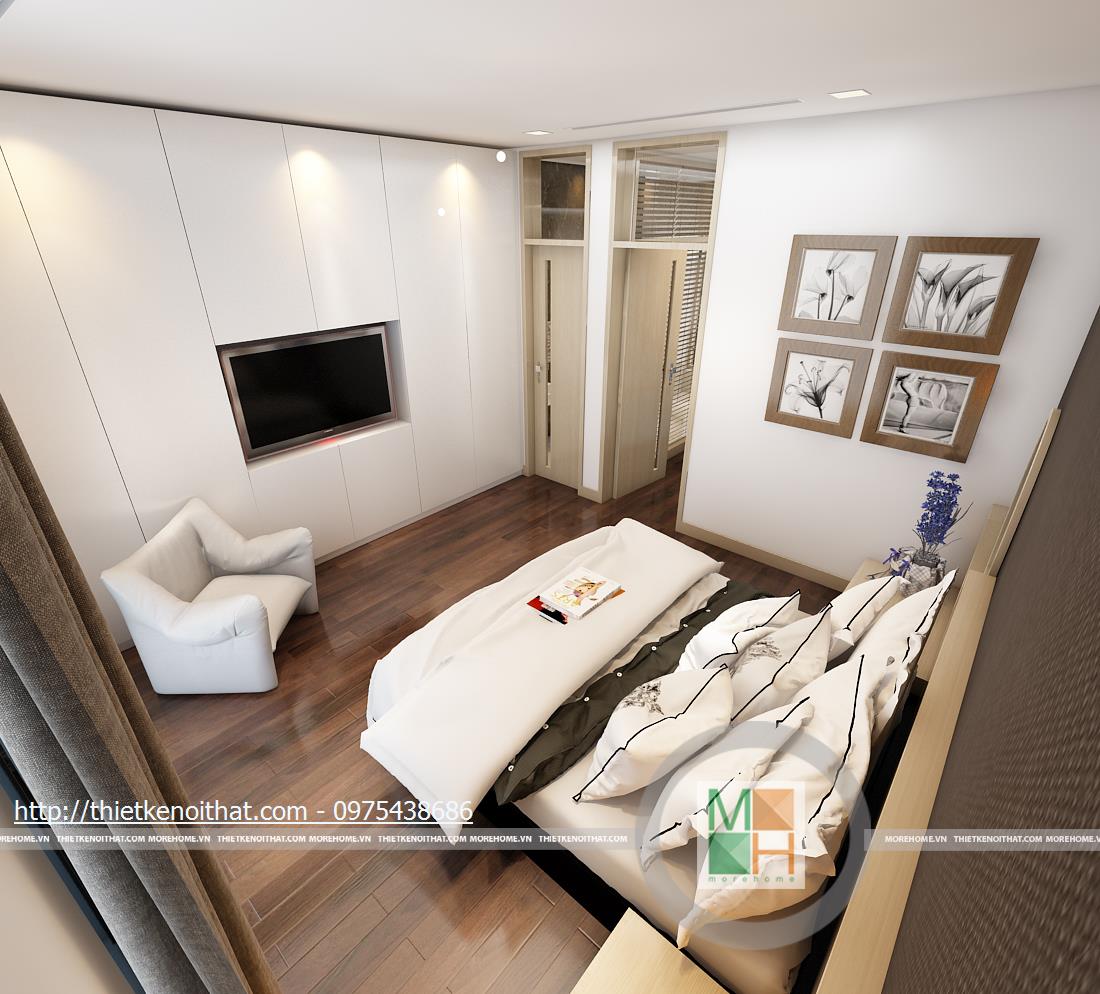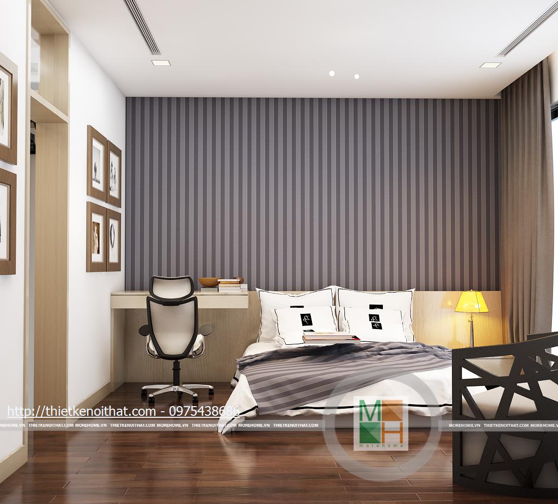 Tầng ba bao gồm phòng ngủ bố mẹ và phòng làm việc. Phòng ngủ của bố mẹ không quá cầu kì với màu sắc nhẹ nhàng, ấm cúng. Tủ quần áo âm tường được đặt cạnh cửa ra vào để tránh làm ảnh hưởng đến việc di chuyển trong phòng và cũng tiết kiệm được diện tích. Phần tường đầu giường được bọc vải ghi để tạo điểm nhấn, làm nổi bật đồ nội thất sáng màu. Phòng làm việc với chiếc bàn gỗ đặt giữa và tủ sách kê sát tường đem lại sự tiện lợi khi sử dụng. Bên hông phòng là cửa kính ngăn cách với khu vườn giả, tạo sự gần gũi với thiên nhiên và đem đến tâm lí thoải mái khi làm việc.