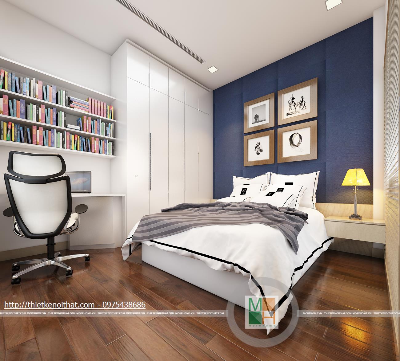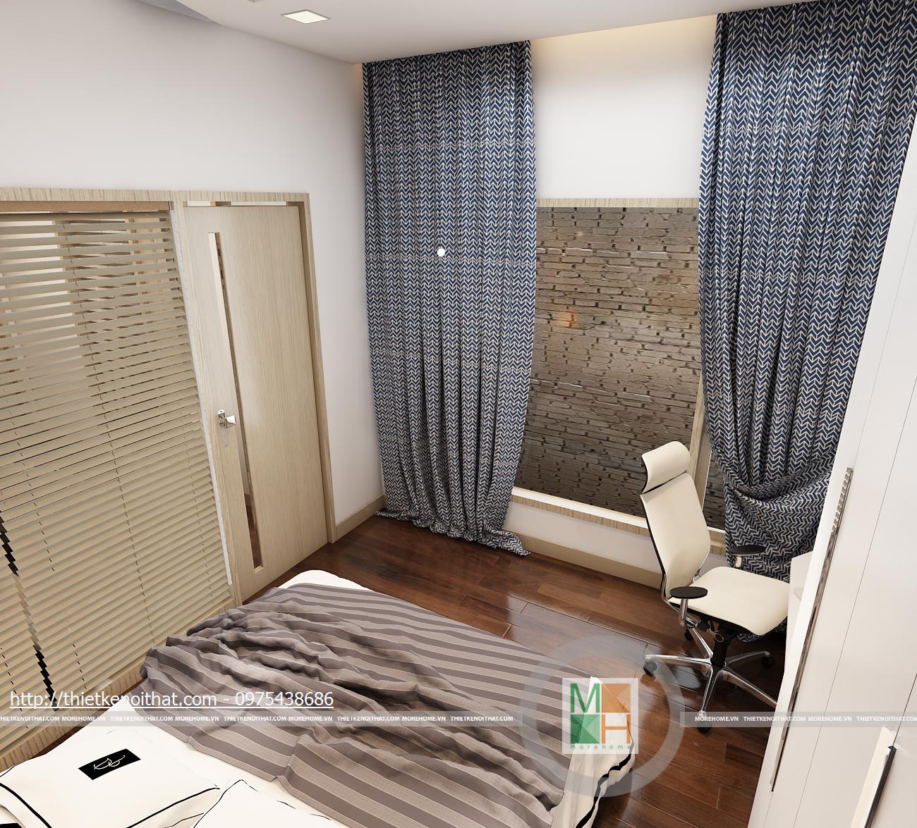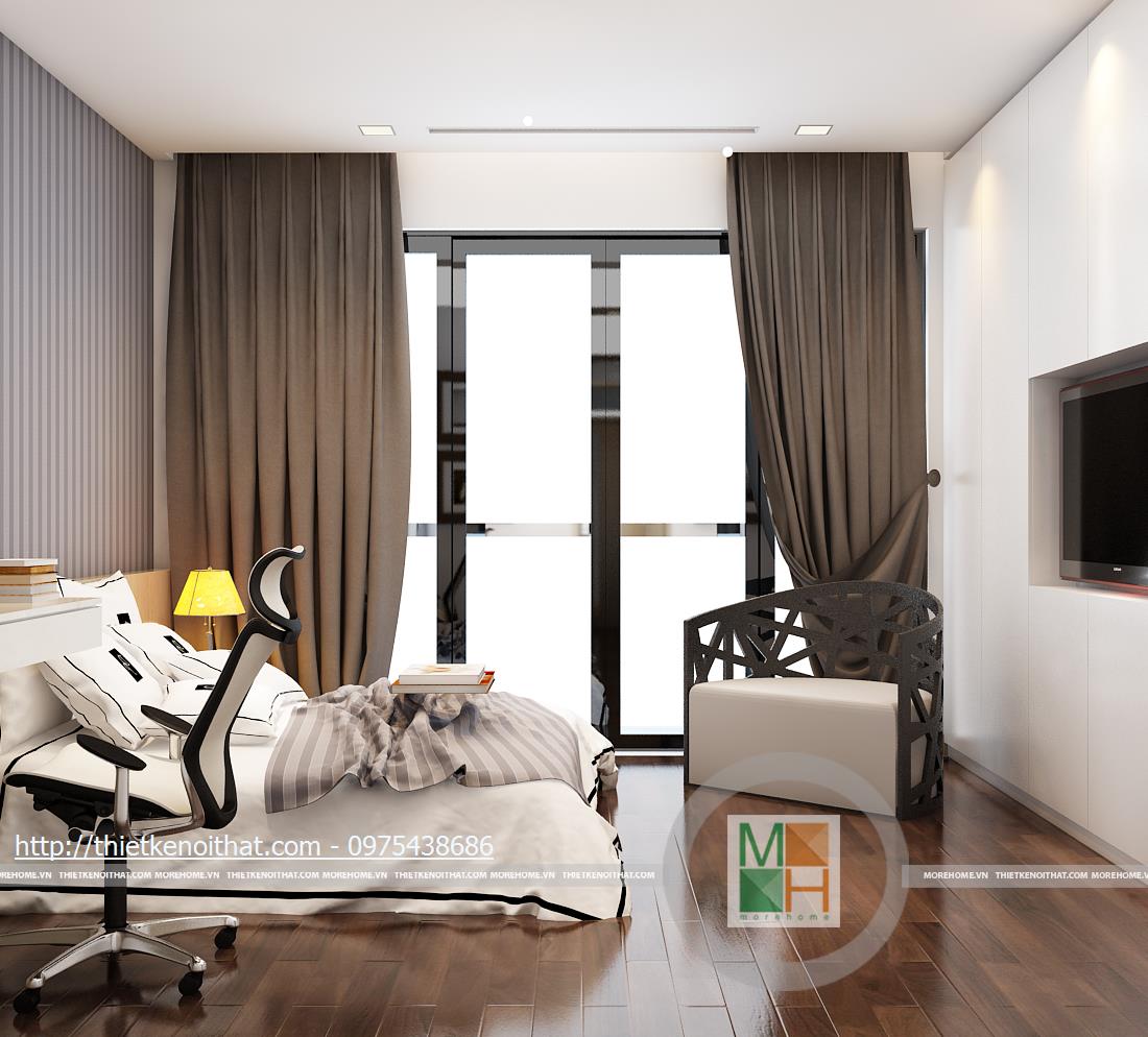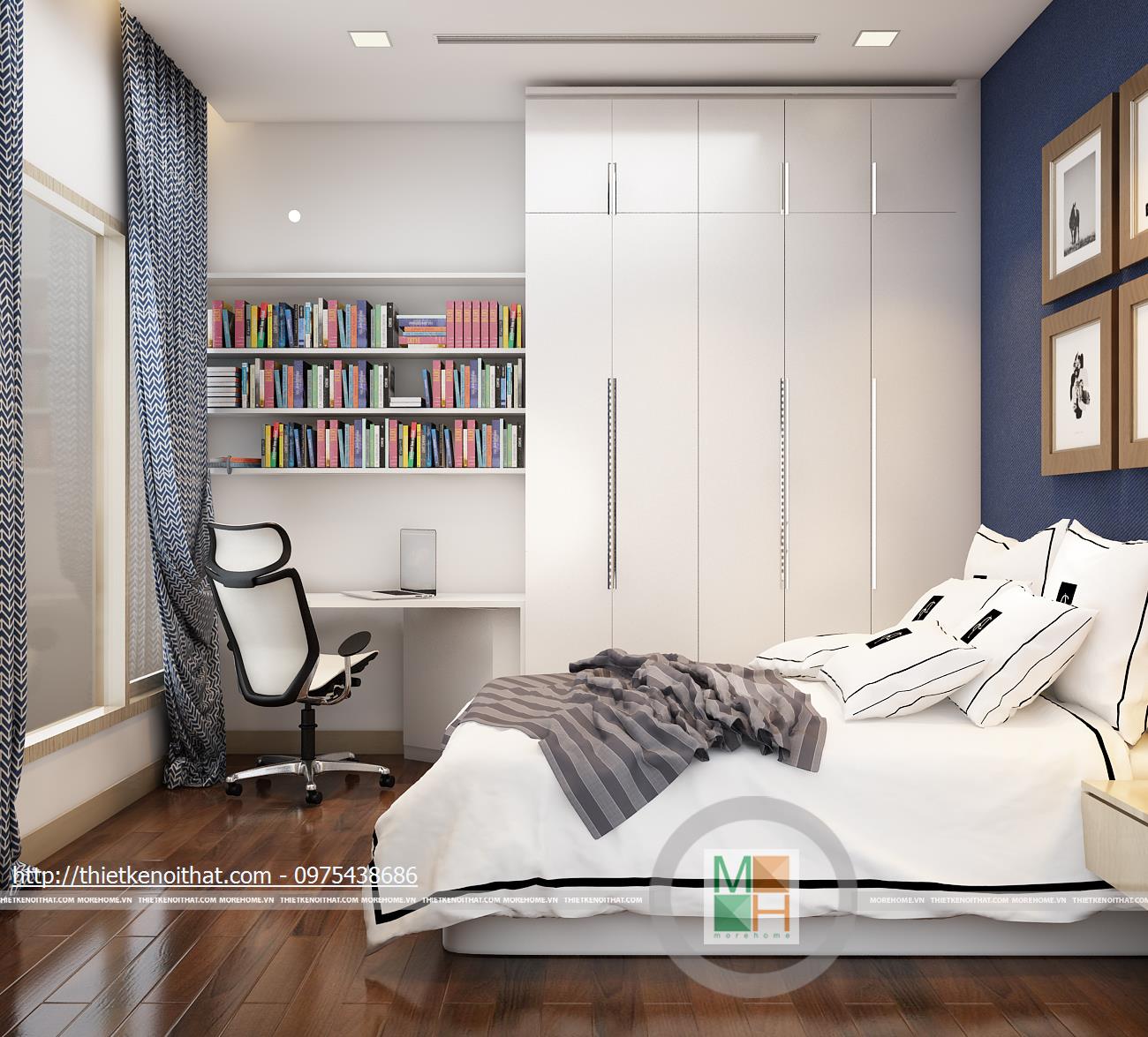 Tầng bốn là phòng ngủ của con và một phòng ngủ phụ. Màu sắc trang trí cho phòng ngủ con tươi sáng, tạo cảm giác năng động và mới mẻ. Hệ thống kệ sách, bàn học và tủ quần áo kê sát nhau để tạo sự liên kết và chắc chắn. Phòng ngủ phụ được trang bị đầy đủ tiện ích với bàn làm việc, ghế tựa độc đáo và tủ sách nhỏ gọn. Cách bố trí màu sắc đan xen khiến căn phòng trở nên đẹp mắt và sinh động.
