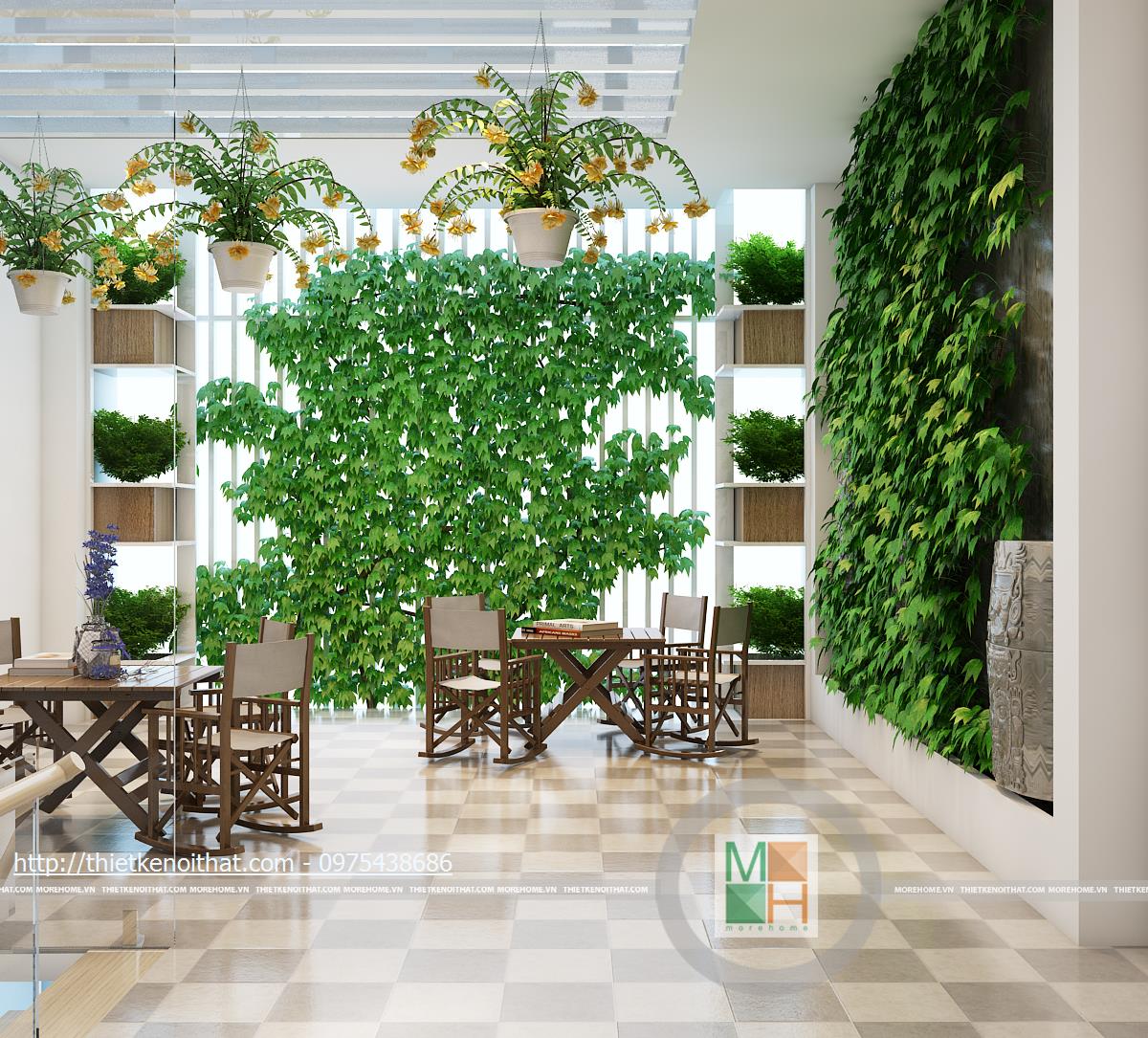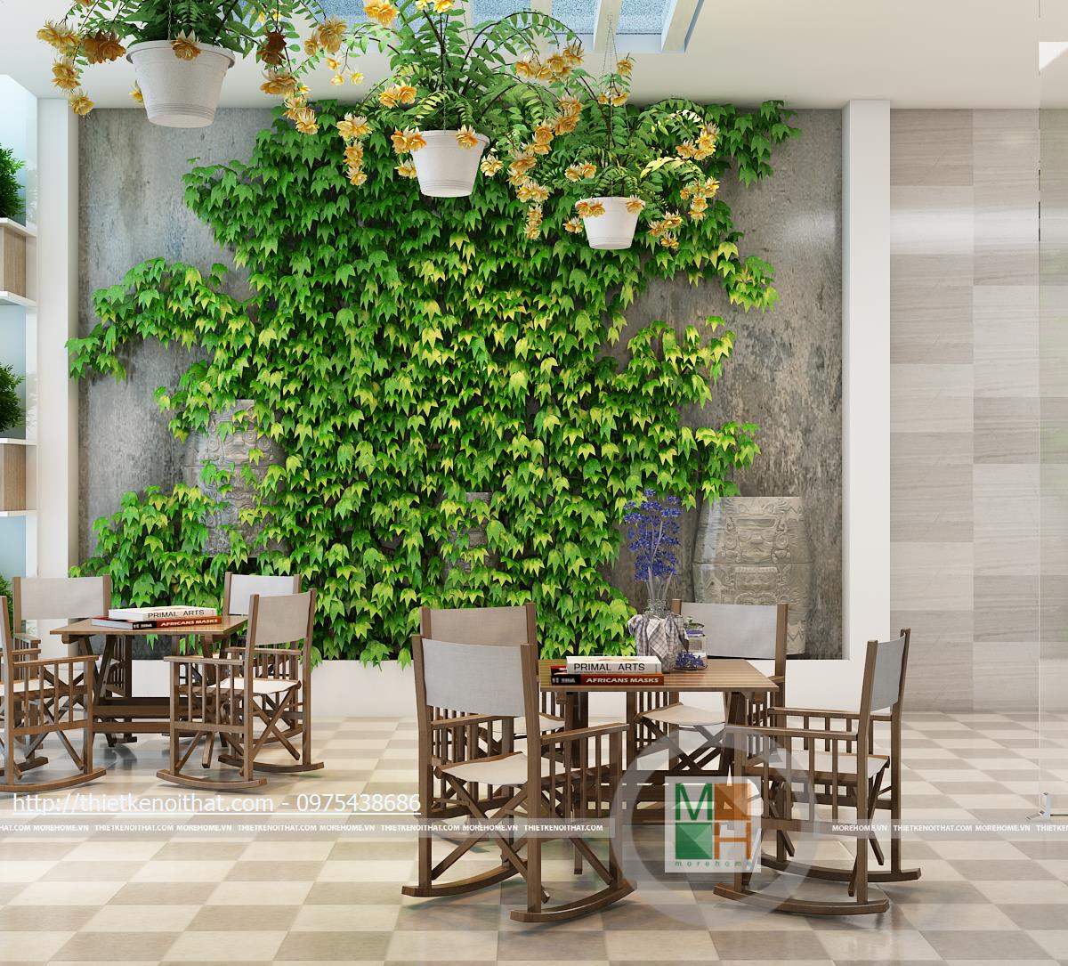 Phòng thờ được đặt ở tầng năm để không làm ảnh hưởng đến không gian sinh hoạt bên dưới. Bàn thờ gỗ được thiết kế đậm chất Á đông, thể hiện lòng thành kính của gia chủ đối với tổ tiên. Bên ngoài là sân thượng với những bộ bàn ghế nhỏ để ngồi uống trà, đọc sách. Để không gian trở nên thơ mộng hơn, một phần tường được trang trí bằng cây cảnh dịu mát.