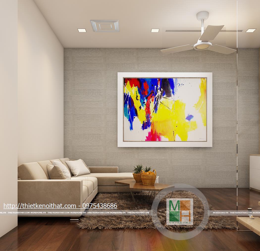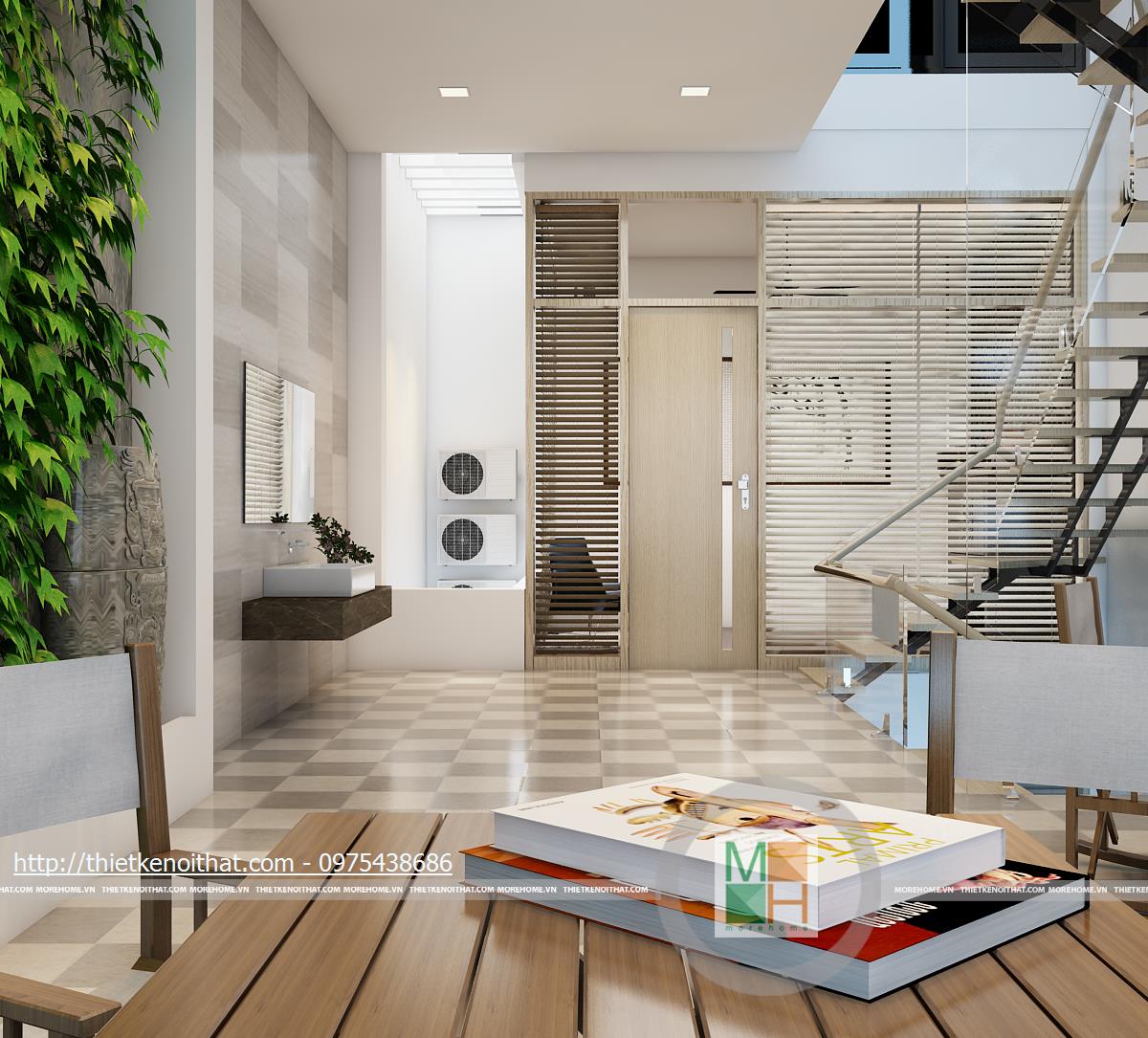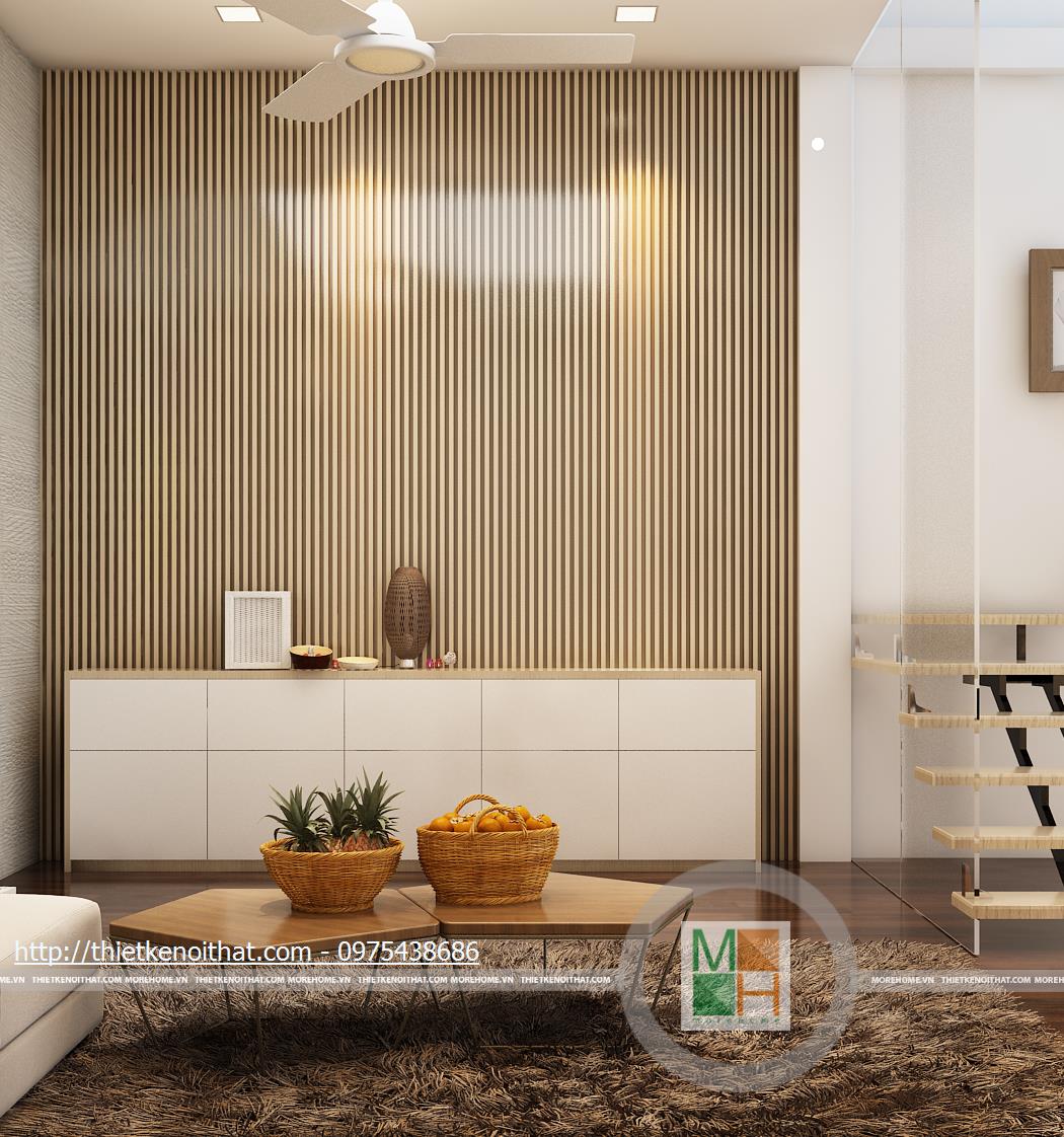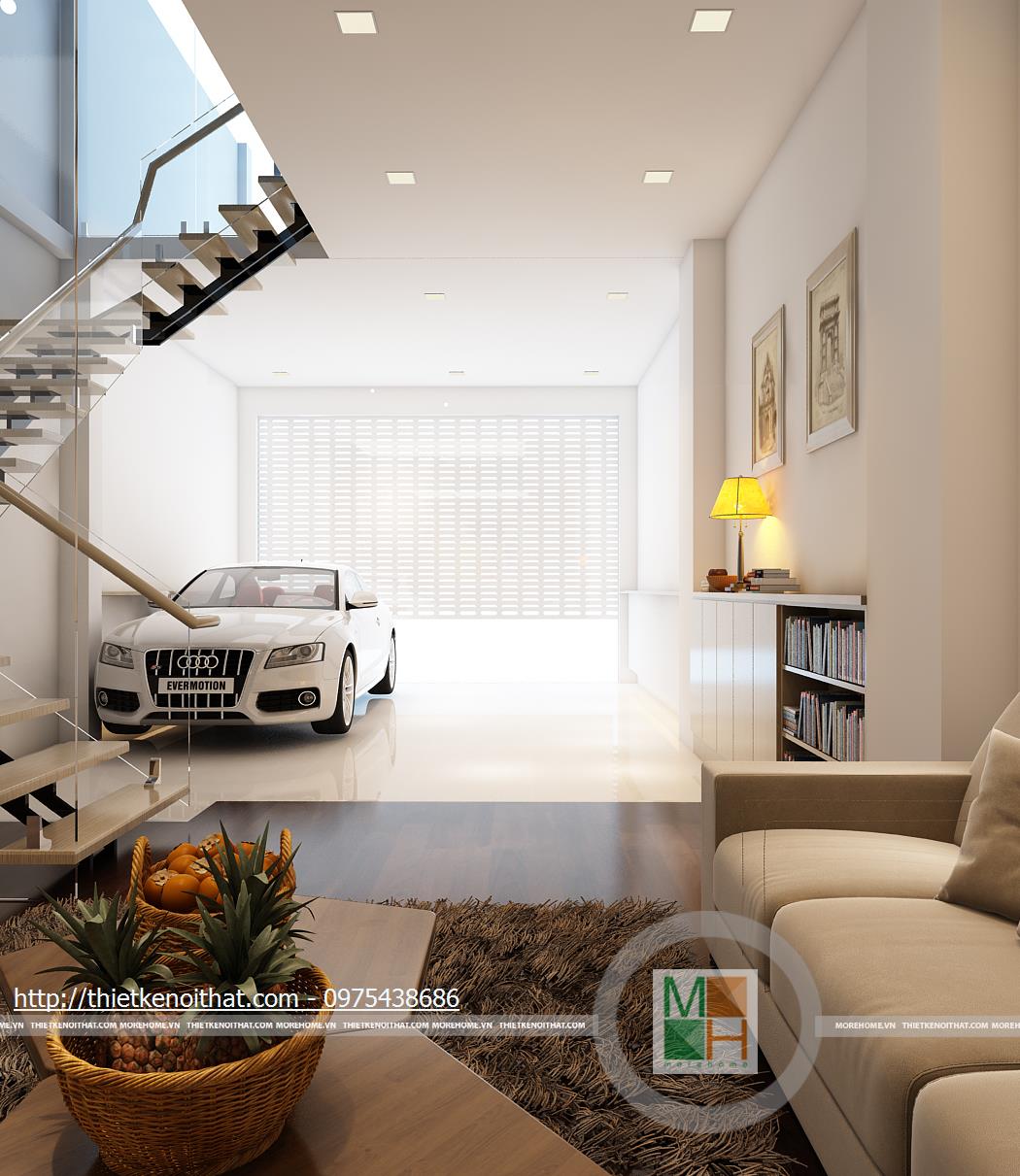Căn hộ liền kề nhà anh Thắng được thiết kế theo phong cách nội thất hiện đại. Diện tích tầng một được chia đôi để dành cho gara và phòng khách phụ. Sàn phòng khách được làm cao hơn và lát gỗ nhằm phân chia không gian và tạo cảm giác dễ chịu. Diện tích phòng khách không rộng nhưng nhờ cách trang trí nội thất và bố trí đồ đạc hợp lí nên không gian trông thoáng đãng và mát mẻ. Ngoài ra, những chi tiết phụ như thảm lông hay bức tranh khổ lớn làm căn phòng trông sang trọng và không bị nhàm chán. Cửa cuốn được lắp đặt giúp việc bảo quản phương tiện đi lại trong nhà được dễ dàng và an toàn hơn. Cầu thang của ngôi nhà được cấu thành từ kính chịu lực và những phiến đá chắc chắn, tạo sự độc đáo.