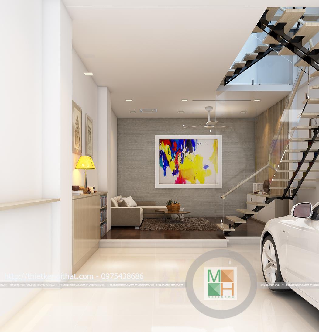 Diện tích tầng một được chia đôi để dành cho gara và phòng khách phụ. Sàn phòng khách được làm cao hơn và lát gỗ nhằm phân chia không gian và tạo cảm giác dễ chịu. Diện tích phòng khách không rộng nhưng nhờ cách sắp đặt nội thất và trang trí hợp lí nên không gian trông thoáng đãng và mát mẻ....