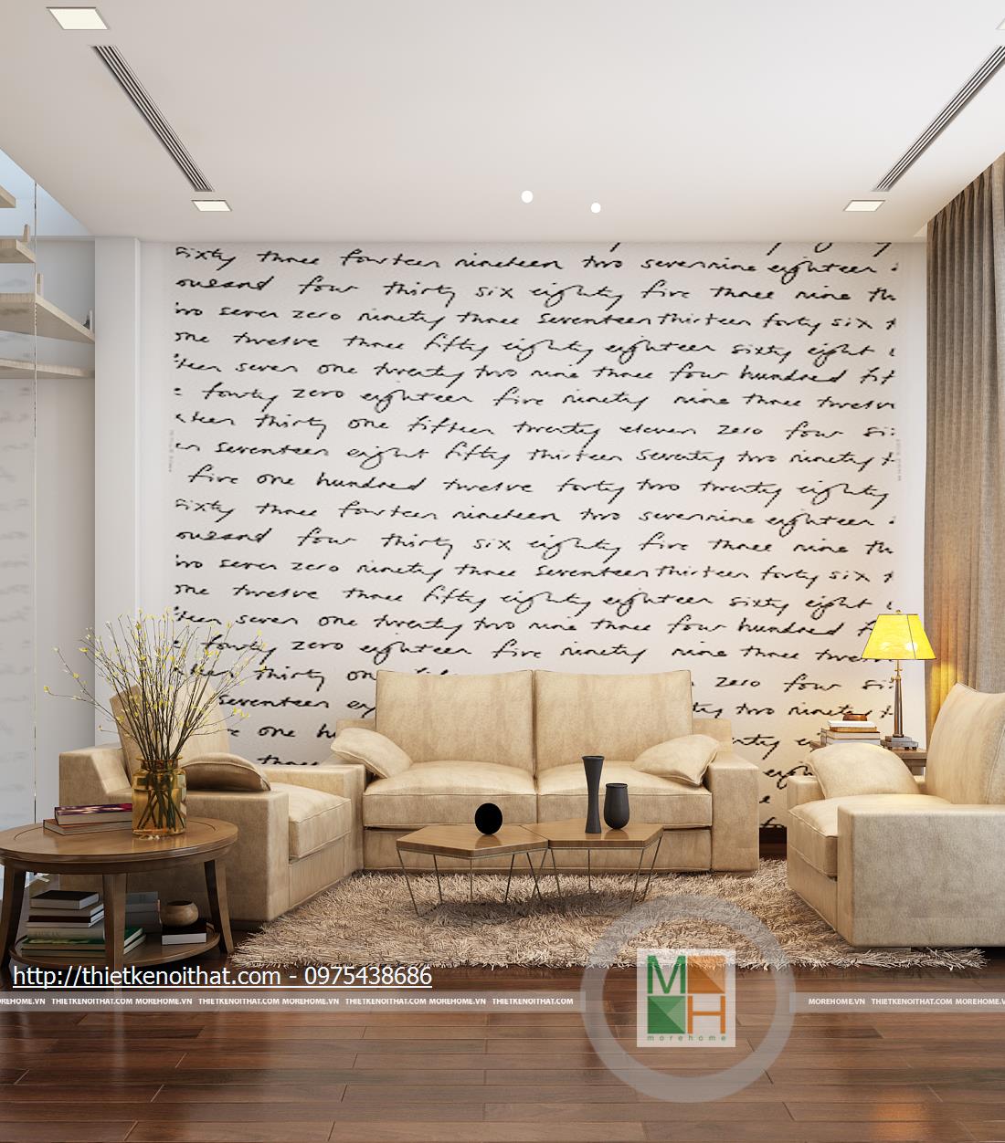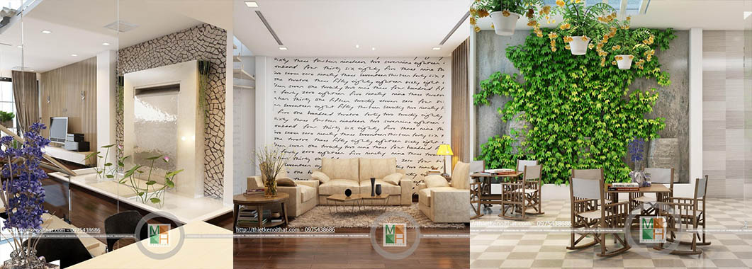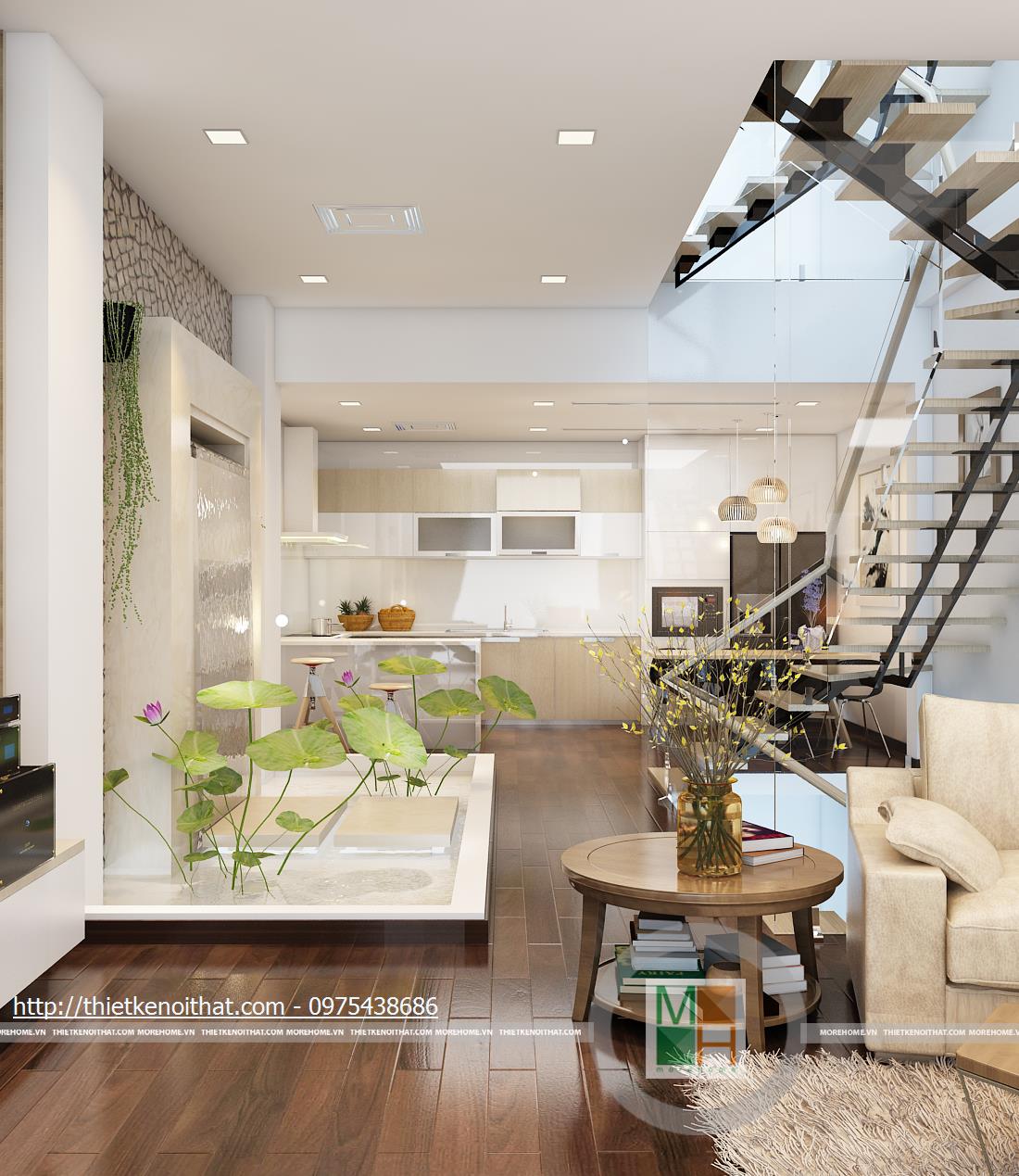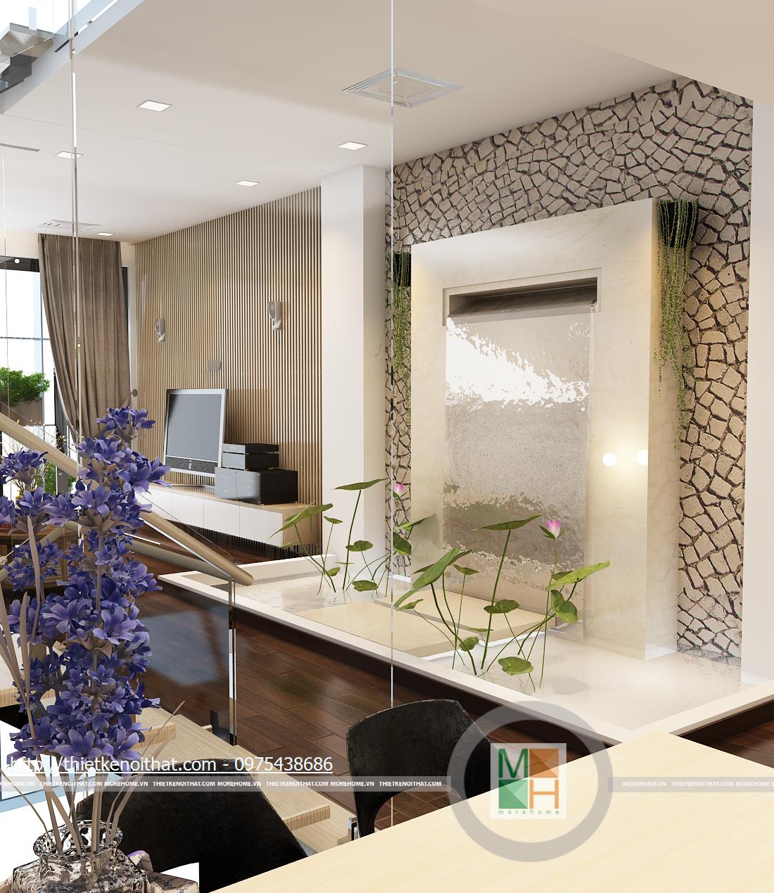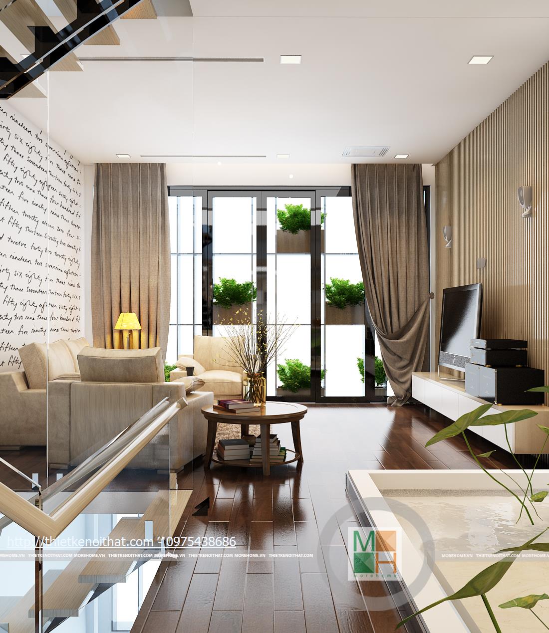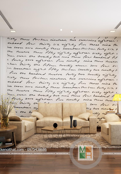 Một điểm rất sáng tạo và độc đáo trong thiết kế nội thất căn hộ này là không gian sinh hoạt chung được thiết kế lịch sự nên có thể sử dụng làm phòng khách thay cho căn phòng dưới tầng một. Mảng tường sơn trắng với những hàng chữ viết tay ở trên thể hiện sự cá tính của gia chủ trong trang trí nhà. Chiếc ghế sofa mà be sữa cũng chính vì thế mà trở nên nổi bật hơn khi đặt cạnh mảng tường. Phần tường bên hông phòng được lắp cửa kính để tăng ánh sáng và tạo ra một không gian mở. Không gian trống ở cạnh cầu thang được tận dụng để đặt một bức tường nước nhỏ, tạo phong thủy và phân chia giữa hai căn phòng.