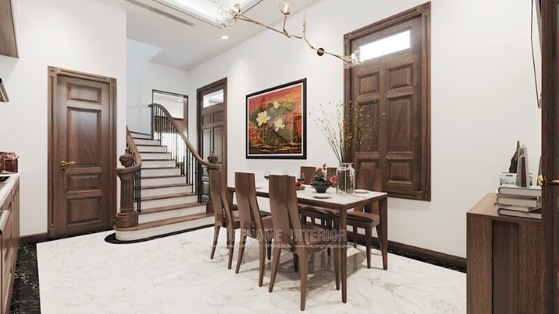 Thiết kế nội thất phòng ăn gỗ óc chó tại biệt thự Đông Anh Hà Nội phong cách hiện đại