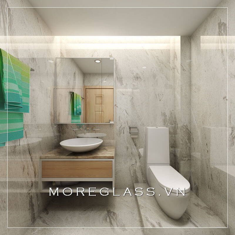 Mẫu thiết kế phòng tắm đẳng cấp được trang bị bằng đá tự nhiên, ốp tường màu trắng vân mây cao cấp sẽ cuốn hút tất cả ánh nhìn.