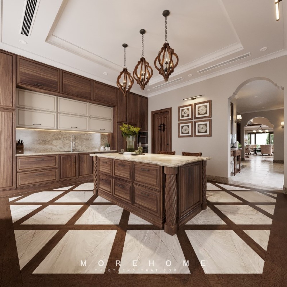 Tủ bếp chữ i gỗ óc chó địa trung hải cung cấp sự thoải mái trong không gian vật dụng, nguyên liệu được sắp xếp gần nhau giúp người nội trợ dễ dàng trong việc nấu nướng hàng ngày.