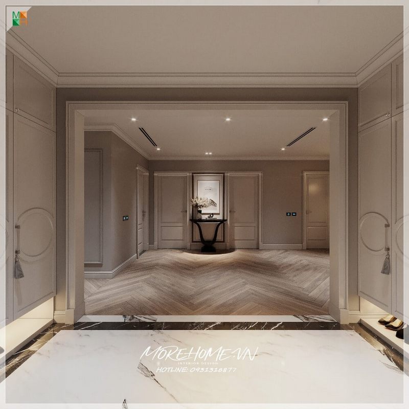Để làm nổi bật không gian phòng khách rộng lớn, bạn có thể sử dụng một chiếc bàn console tân cổ điển gỗ óc chó và một bức tranh canvas nghệ thuật đẹp mắt.
